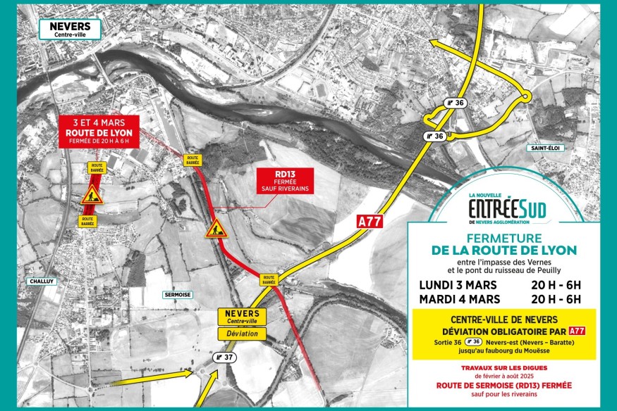Radio Numéro 1 - Dans le cadre du « Projet Entrée Sud", la route de Lyon sera temporairement fermée à la circulation durant deux nuits, les 3 et 4 mars, afin de réaliser des travaux d’amélioration. Cette fermeture concernera le tronçon situé entre l’impasse des Vernes et le pont du ruisseau de Peuilly, sur les communes de Challuy et Sermoise-sur-Loire.