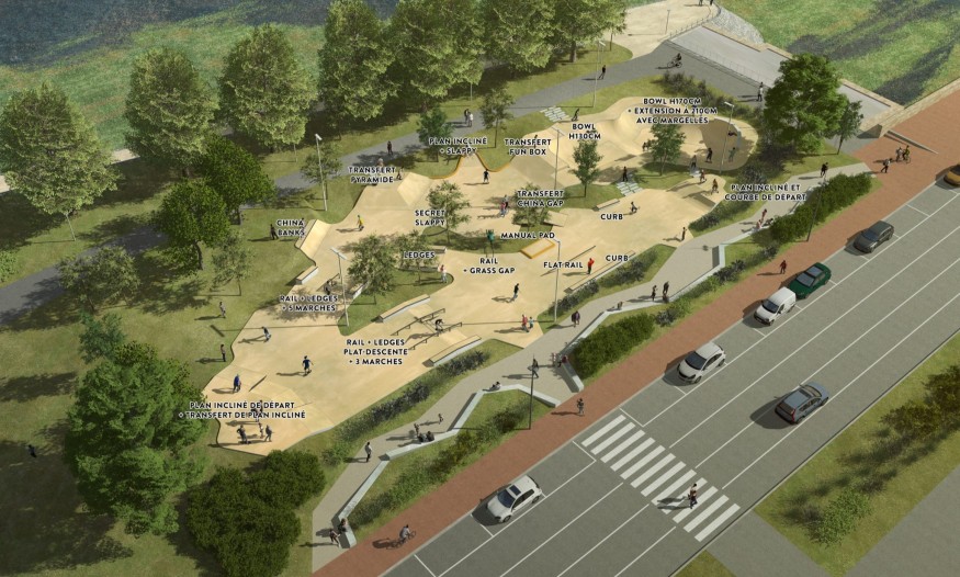 -Un bowl d’environ 425 m², une zone de street de 620 m² et 15 modules intégrés (pour les experts : plans inclinés, transferts, ledges (plat et en descente), rails, curbs, marches et manual pads…)