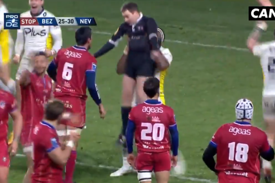 Alors que l'arbitre du match de Pro D2 entre Béziers et Nevers siffle la fin de la rencontre et la victoire des neversois (25-30), l'ailier de Nevers Josaia Raisuqe... soulève l'homme en noir !