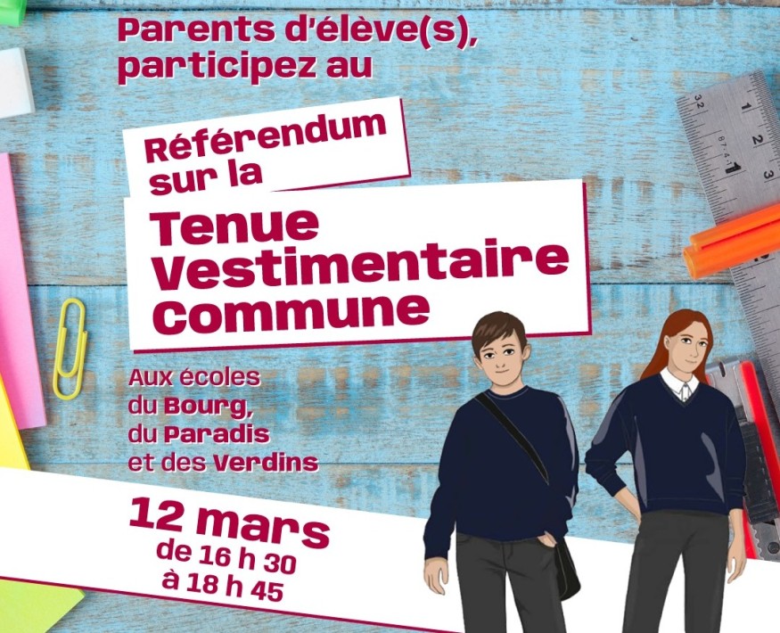 Ce mardi 12 mars, les parents d'élèves sont invités à participer au référendum sur la Tenue Vestimentaire Unique des trois groupes scolaires de Saint-Doulchard : Le Bourg, Paradis et Verdin.